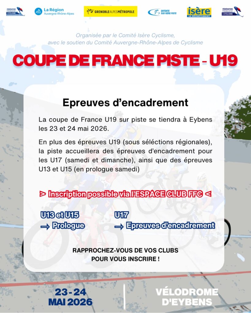 Le Comité Isère de cyclisme est heureux d’annoncer qu’il sera, cette année, l’association porteuse de la Coupe de France Piste U19, qui se tiendra les 23 et 24 mai prochains à Eybens.